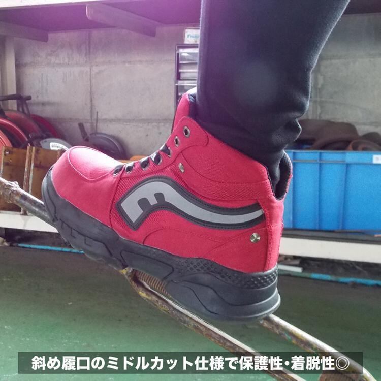 ●足首まで保護するミドルカット仕様、斜めの履口で脱ぎ履きも簡単